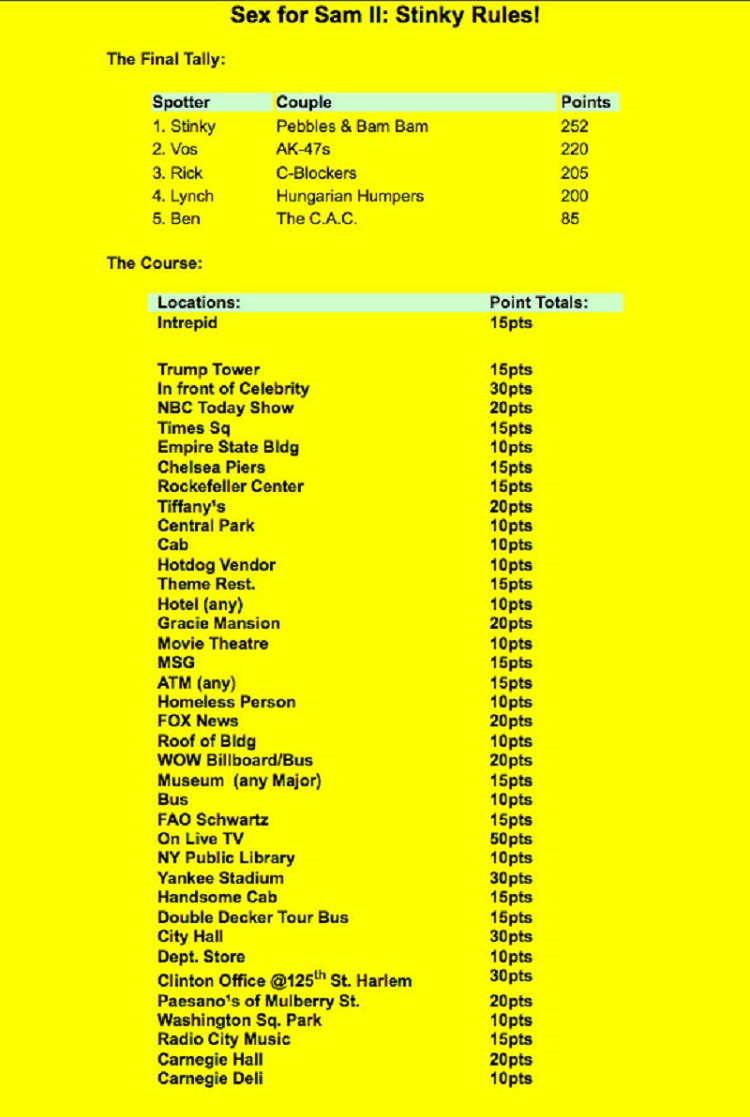 Sex for Sam was a contest for couples to have sex in public, at different locations for points (with a spotter verifying). The "two-point conversion" was using the balloon knot. Winners would get a chance to tour the Sam Adams brewery.